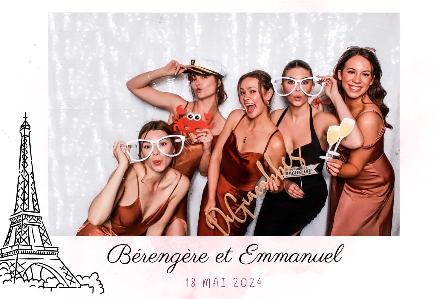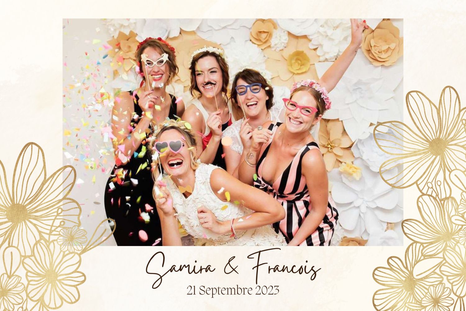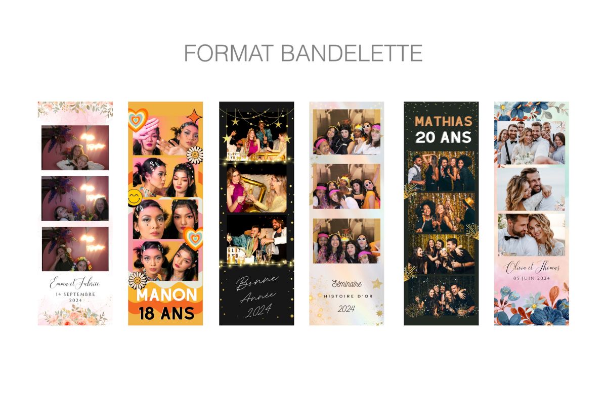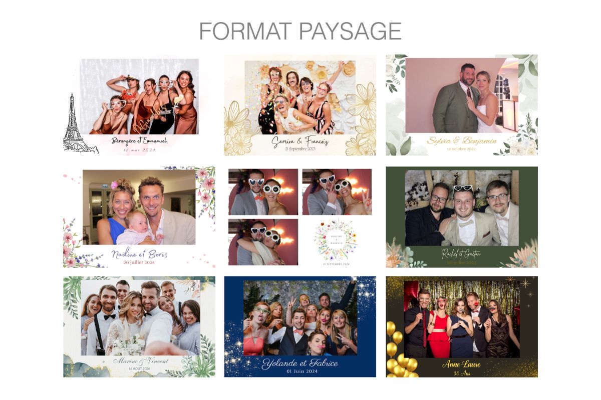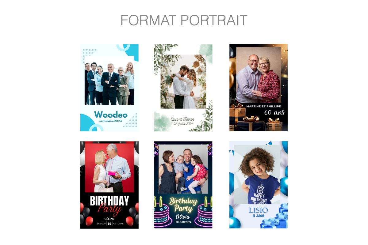 D’un simple clic, vos proches immortalisent un moment de complicité, en solo ou en groupe, avec ou sans accessoires. Chaque photo est instantanément imprimée et personnalisée à l’image de votre événement (couleurs, logo, date, message, etc.).